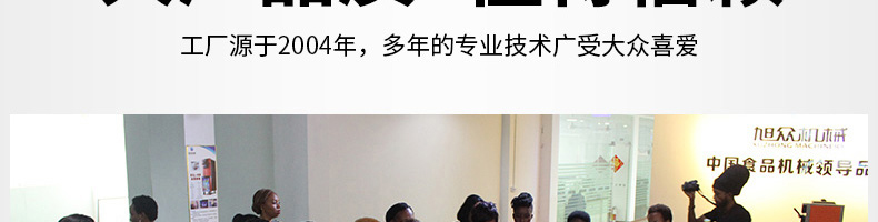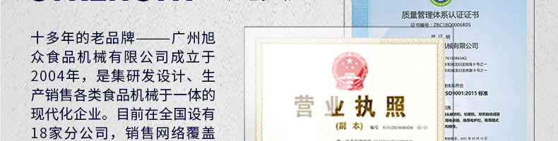廣州旭眾食品機(jī)械有限公司是一家集科研開(kāi)發(fā),生產(chǎn)設(shè)計(jì),營(yíng)銷服務(wù)為一體的現(xiàn)代化生產(chǎn)企業(yè)?,F(xiàn)代化生產(chǎn)車間,精湛制造技術(shù),所產(chǎn)機(jī)械歷經(jīng)市場(chǎng)重重考驗(yàn),不斷贏得海內(nèi)外客戶的贊譽(yù)。