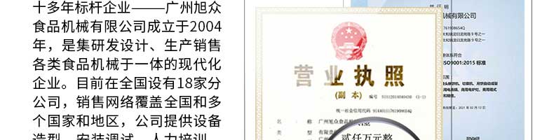 廣州旭眾食品機(jī)械有限公司是一家集科研開發(fā),生產(chǎn)設(shè)計(jì),營(yíng)銷服務(wù)為一體的現(xiàn)代化生產(chǎn)企業(yè)?,F(xiàn)代化生產(chǎn)車間,精湛制造技術(shù),所產(chǎn)機(jī)械歷經(jīng)市場(chǎng)重重考驗(yàn),不斷贏得海內(nèi)外客戶的贊譽(yù)。