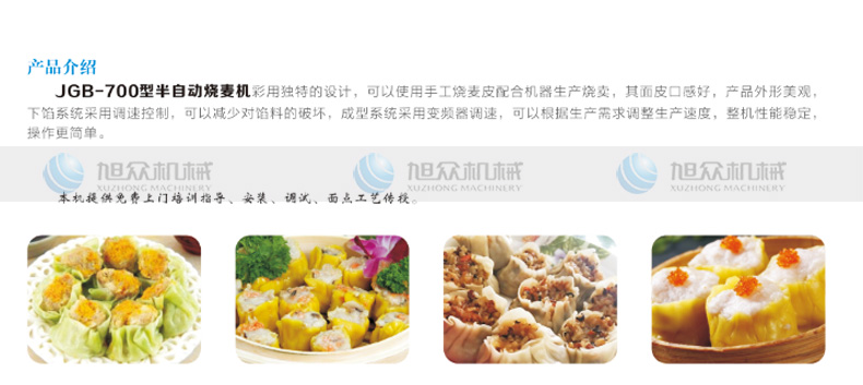 JGB-700燒麥機,采用特的設計,可以使用手工燒麥皮配合機器生產燒賣,其面皮口感好,產品外形美觀下餡系統采用調速控制,可以減少對餡料的破壞,成型系統呆用變頻器調速,可以根據生產需求調整生產速度,整機性能穩(wěn)定操作更簡單