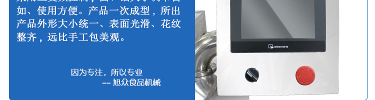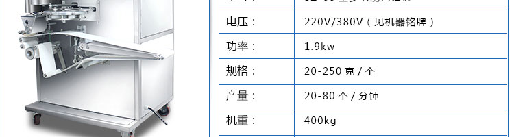 名稱SZ-65型多功能自動包餡機(jī) 電源220/380V 功率1.9kw 產(chǎn)量20-80個/分鐘 尺寸1130*920*1650mm 重量400kg 規(guī)格20-250克/個 其他皮餡比例2:8 5:5